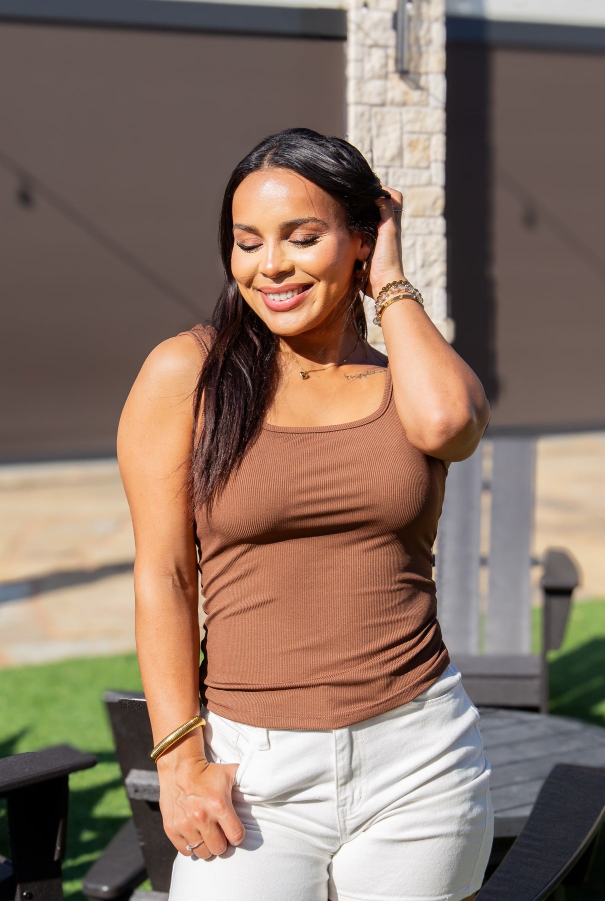 This rib knit tank top features a structured square neckline and a relaxed, mom crop fit that sits comfortably without clinging. Made with high-stretch fabric, it moves with the body while offering gentle support. The unlined finish keeps it lightweight and breathable—perfect for everyday ease with a soft, body-flattering silhouette.